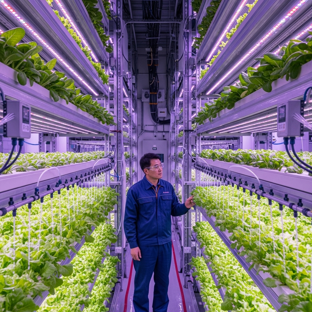 스마트팜 내부의 자동 관수 및 조명 시스템이 작동 중인 장면, CAPA 파트너의 스마트 농업 설비 구축 사례