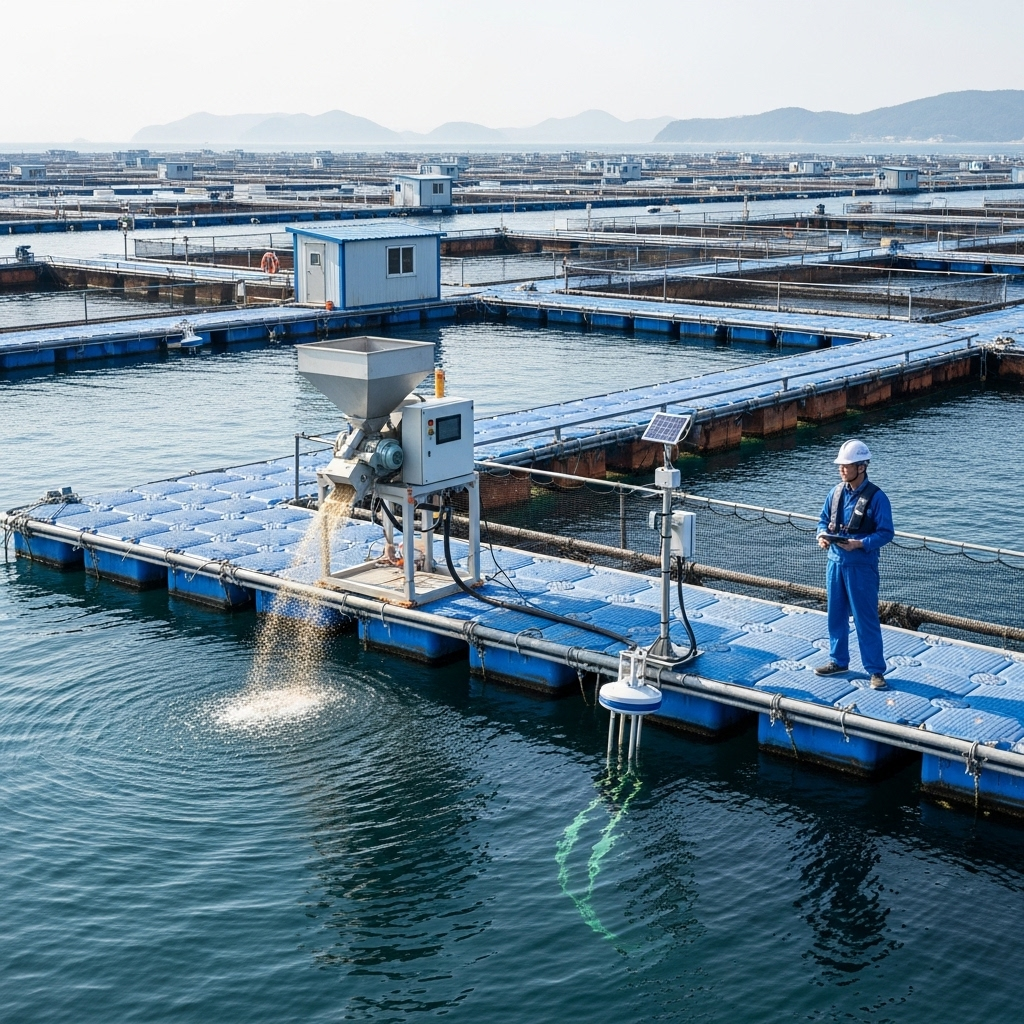 수산 양식장에서 자동화 설비가 작동 중인 장면, CAPA 협업으로 효율적인 수산 생산 환경 구축
