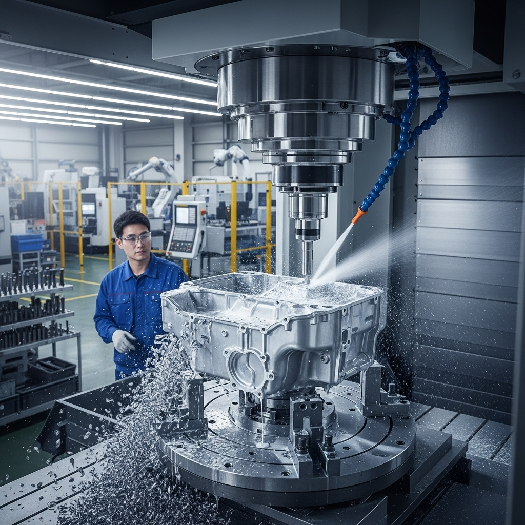 알루미늄 하우징을 5축 CNC로 가공하는 공정 모습, 사이클타임과 수율을 고려한 단가 최적화 설명과 함께 CAPA 활용 맥락 포함