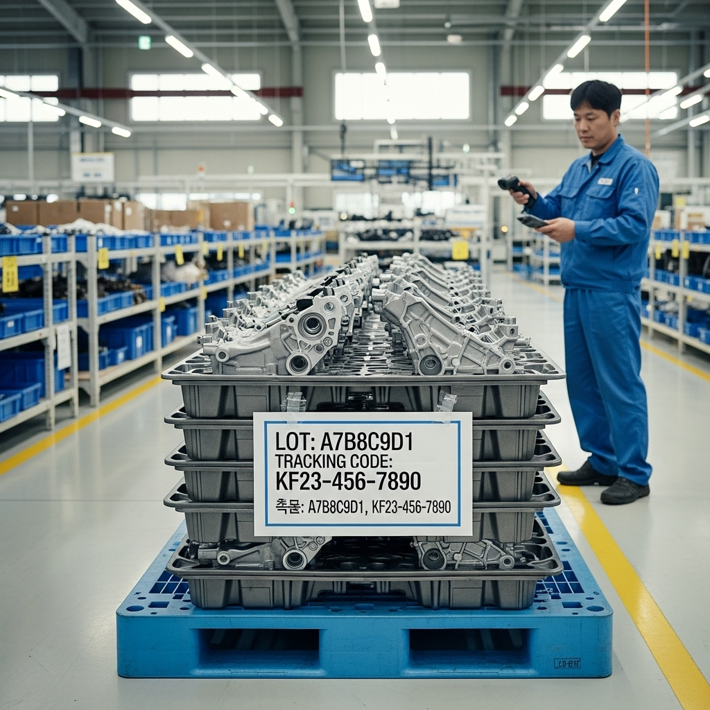 양산 완료된 자동차 부품을 로트 추적 라벨과 함께 포장·출하 준비 중인 모습, 정시납품과 품질 문서화 강조, CAPA 파트너 활용