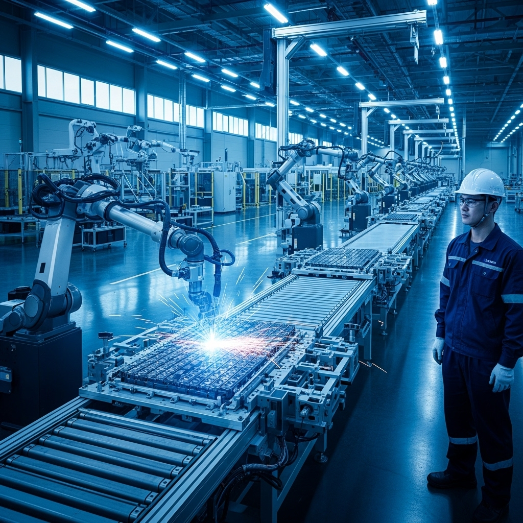 자동화된 배터리 모듈 조립라인에서 용접 로봇이 셀을 연결하는 장면, 품질과 안전성 중심의 CAPA 파트너 공장