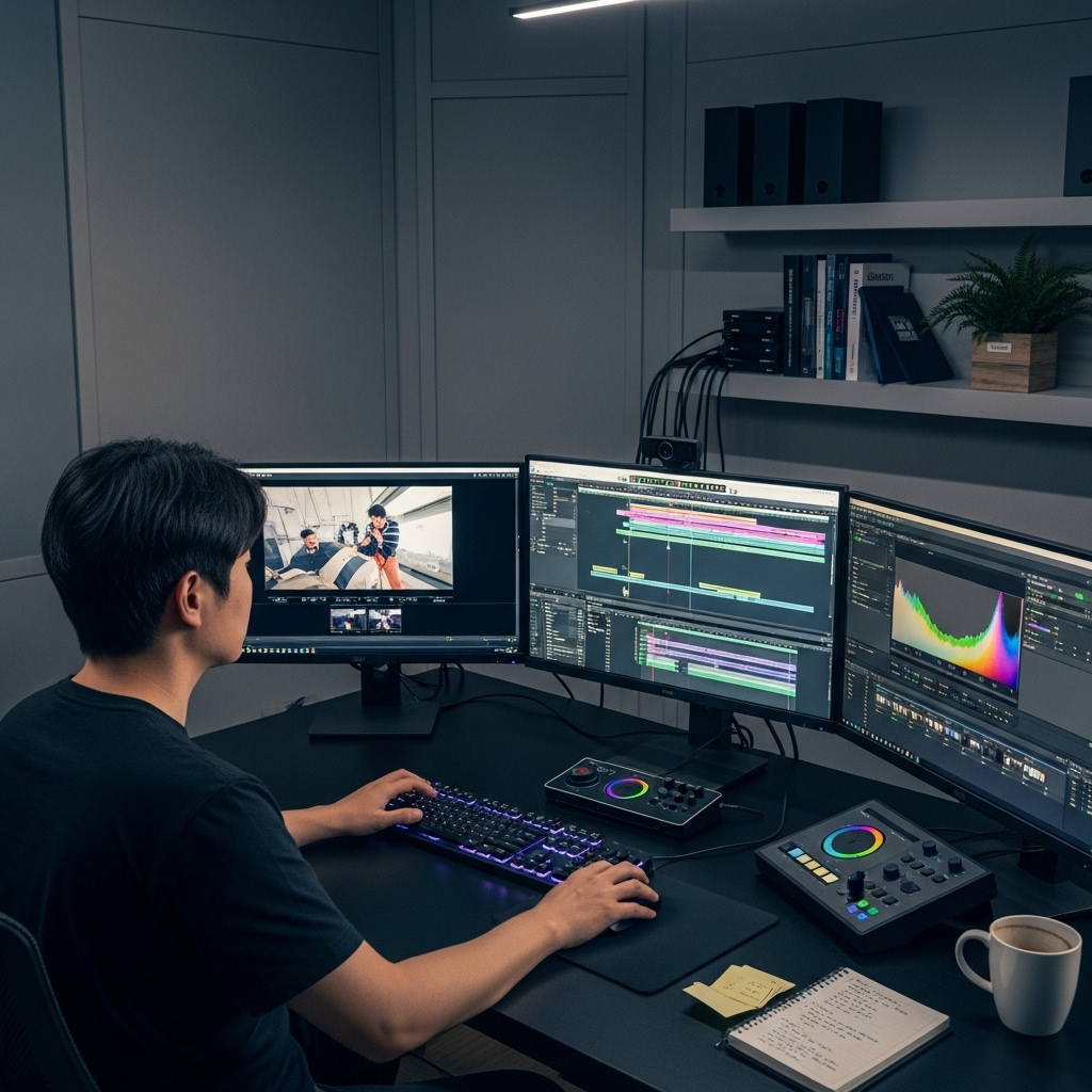 3) 편집 및 후반 작업 – 색보정, 음향 믹싱, 자막, 그래픽 삽입.