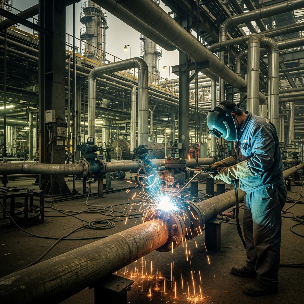 정유 플랜트 배관 부품을 용접하는 장면, ASME 인증 공정에서 작업 중인 CAPA 제조 파트너 사례