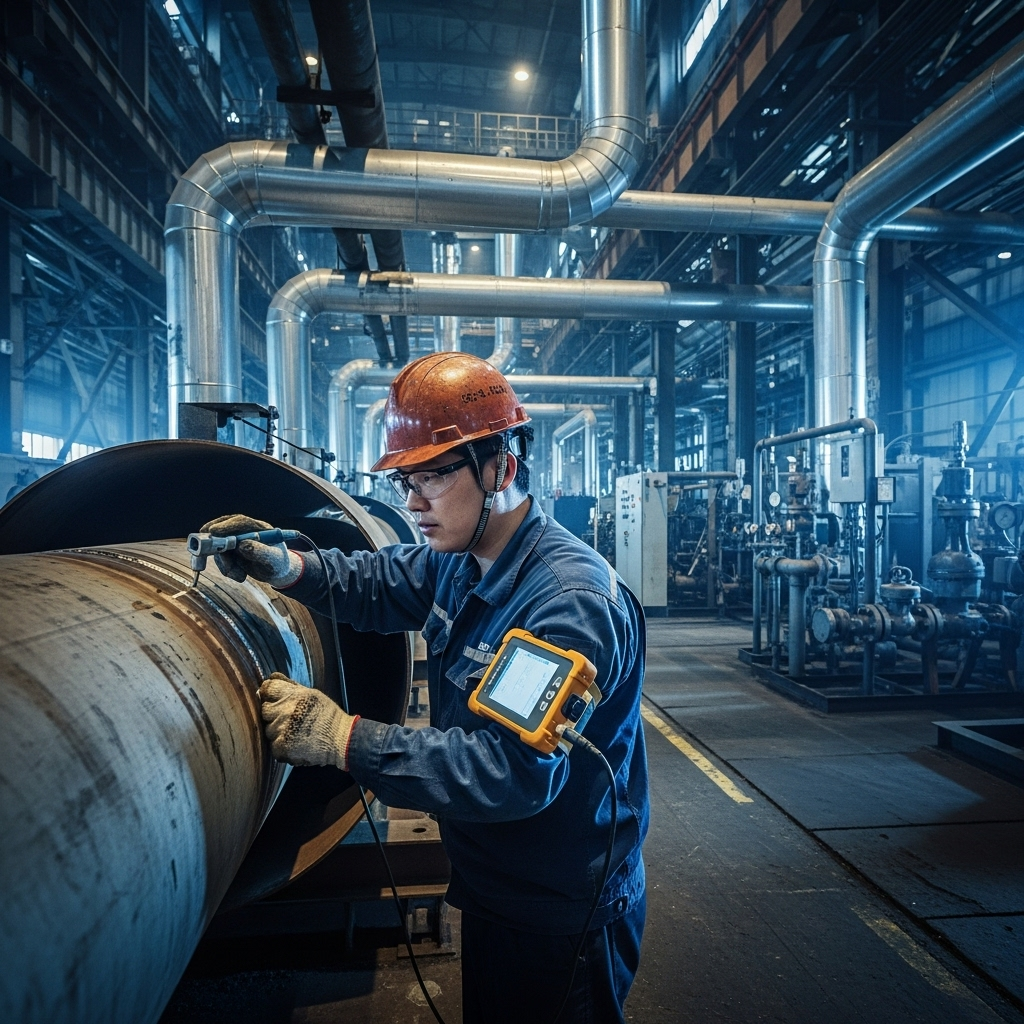 비파괴검사 장비로 화학 설비용 파이프를 검사하는 엔지니어, 품질 검증과 CAPA 파트너 공장 사례