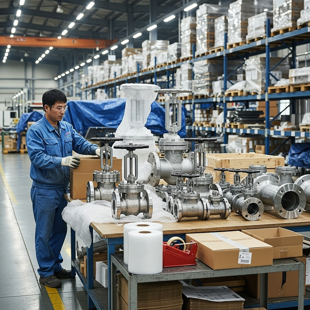 완성된 화학 설비용 밸브 세트를 부식 방지 포장하는 장면, CAPA 인증 제조 파트너의 납품 과정