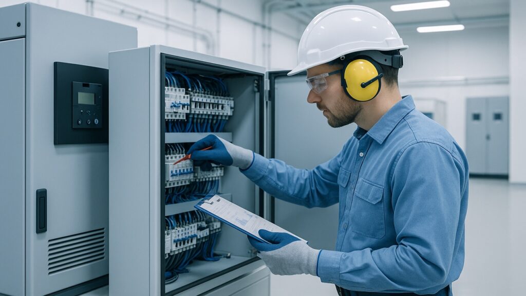 안전장비를 착용한 엔지니어가 전기설비 점검을 수행 중인 장면, CAPA 파트너 유지보수 사례