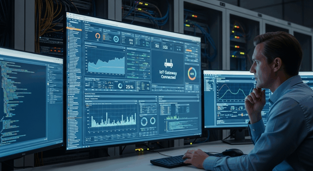 PLC, IoT 게이트웨이, 클라우드 서버를 연결해 설비 데이터를 중앙 시스템으로 전송합니다.