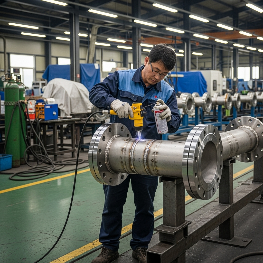 스테인리스 파이프 플랜지를 용접 후 MT 비파괴검사를 수행하는 장면, ISO 3834 기준에 따른 품질관리 절차, CAPA 활용 사례