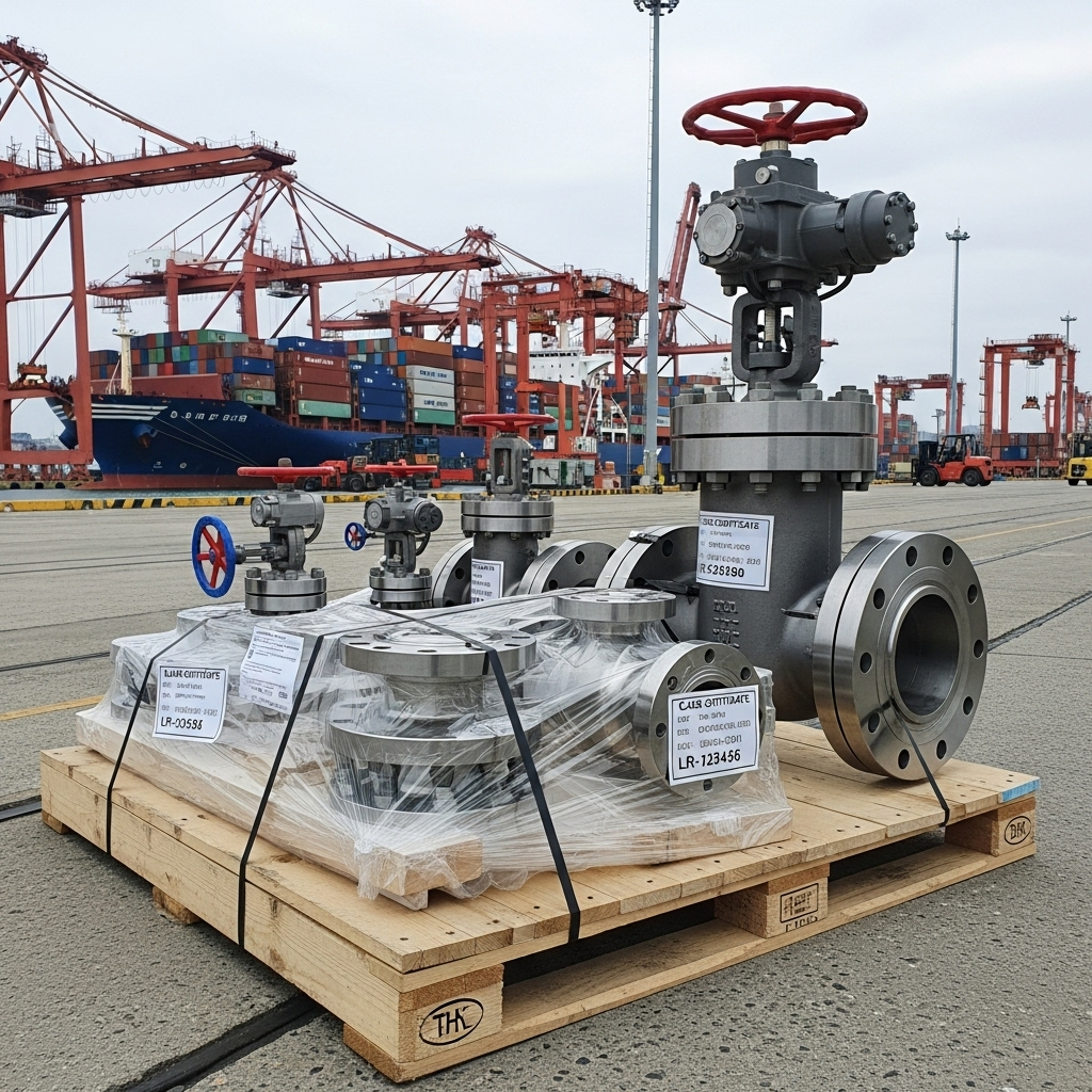 선박용 밸브와 플랜지 세트를 선급 인증 라벨과 함께 포장·출하하는 장면, 품질 문서화와 납기 관리 강조, CAPA 파트너 공장