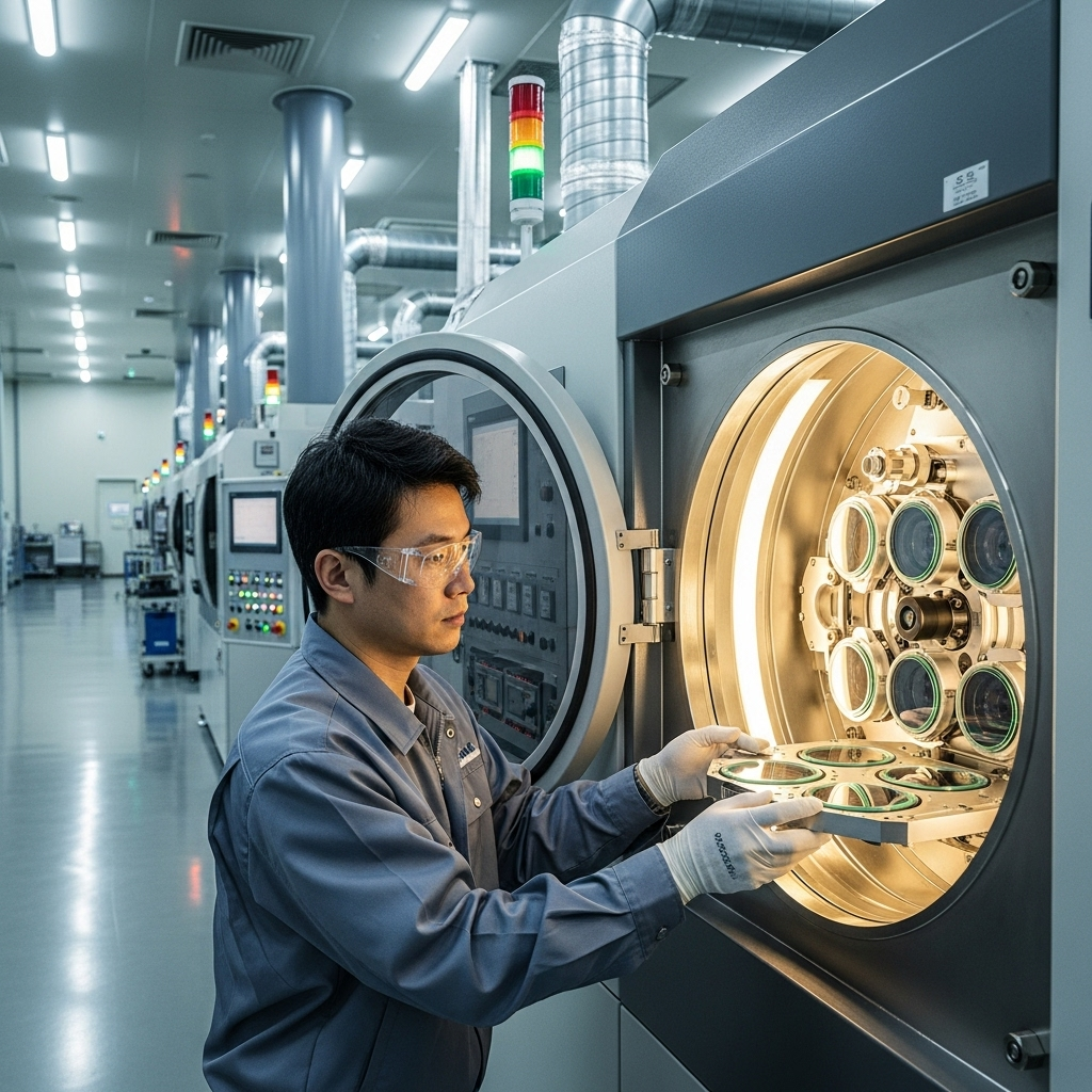 진공 증착 설비에서 AR 코팅 공정을 수행하는 장면, Optical 코팅 품질과 균일도 관리 중심의 CAPA 제조 파트너 사례