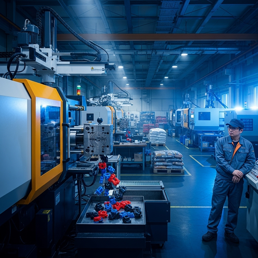 사출 금형 기계에서 플라스틱 부품을 생산하는 장면, CAPA 인증 제조 파트너의 사출 공정 사례