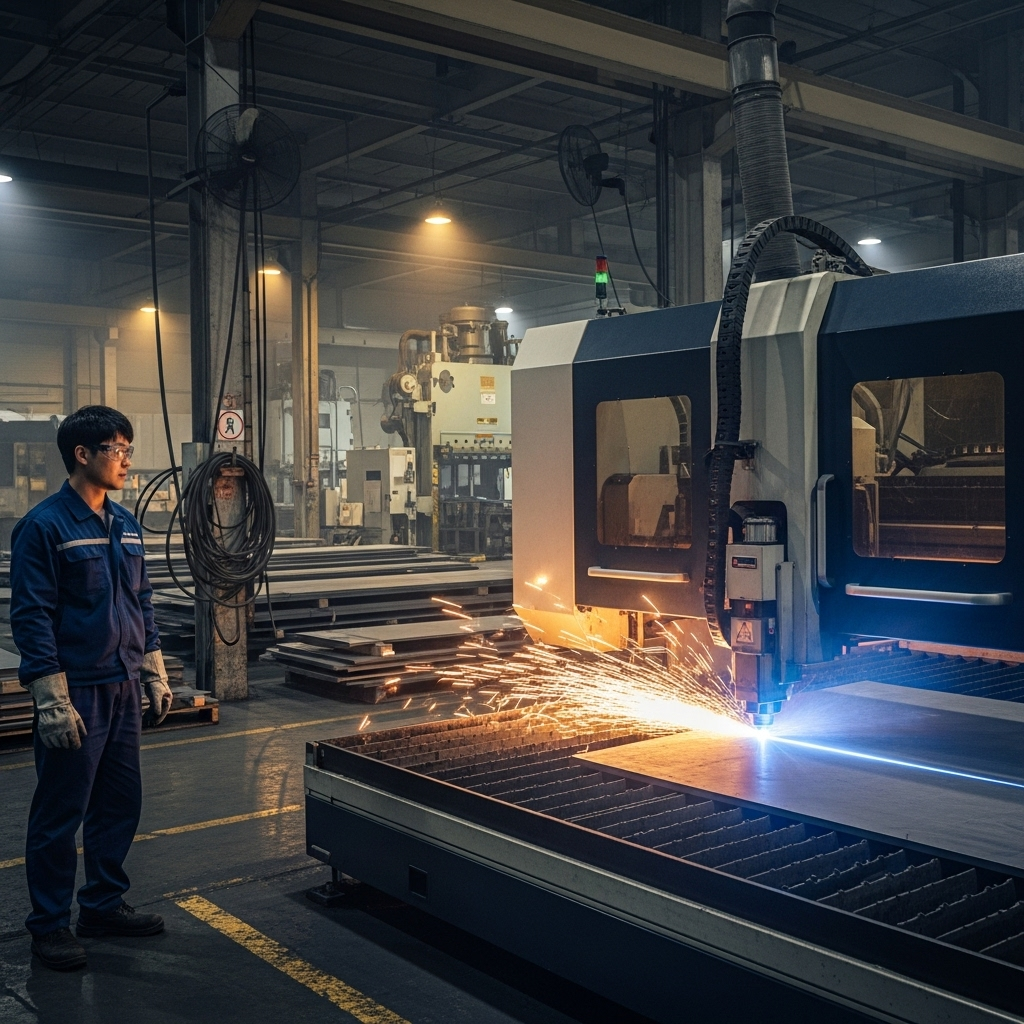산업용 레이저 절단기로 철강 판재를 절단하는 장면, CAPA 인증 제조 파트너의 금속 가공 공정