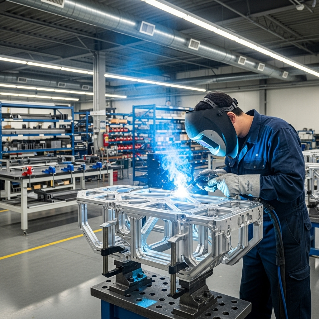 TIG 용접을 통해 알루미늄 프레임을 조립하는 장면, CAPA 제조 파트너의 비철금속 용접 사례