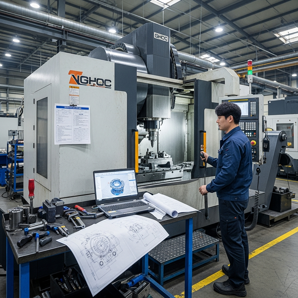 도면과 3D 파일을 확인하며 CNC 장비를 세팅하는 작업자와 가공 공정 현장을 담아 부품 제작 요구조건 정리와 견적 안정화를 설명