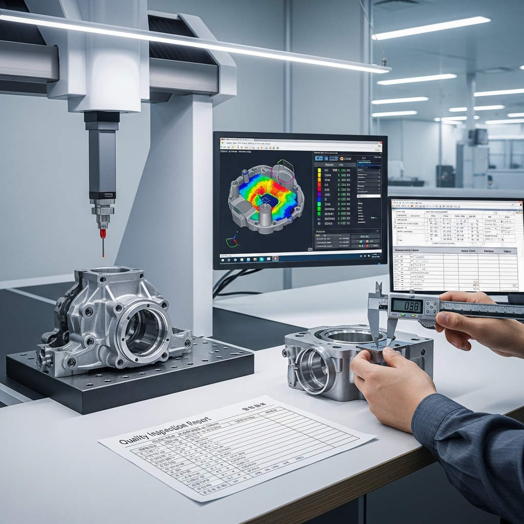 CMM과 버니어캘리퍼스로 핵심 치수를 검사하는 금속 부품 샘플을 클로즈업해 부품 제작 품질 기준과 성적서 흐름을 안내