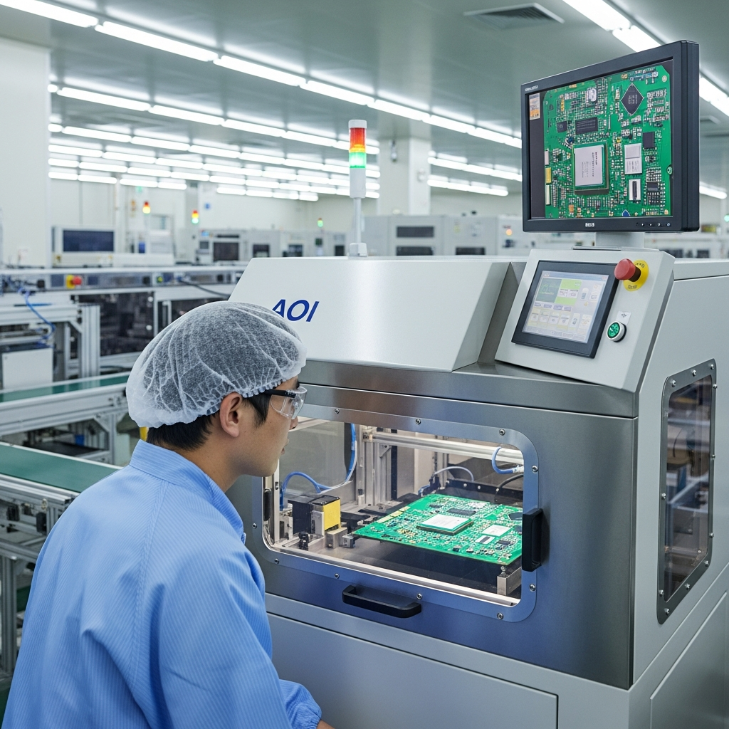 IoT 제품 OEM 공정에서 통신 모듈이 실장된 회로 기판을 엔지니어가 AOI 장비로 검사하는 장면, SMT 라인·시리얼 추적성 관리, CAPA 파트너 사례