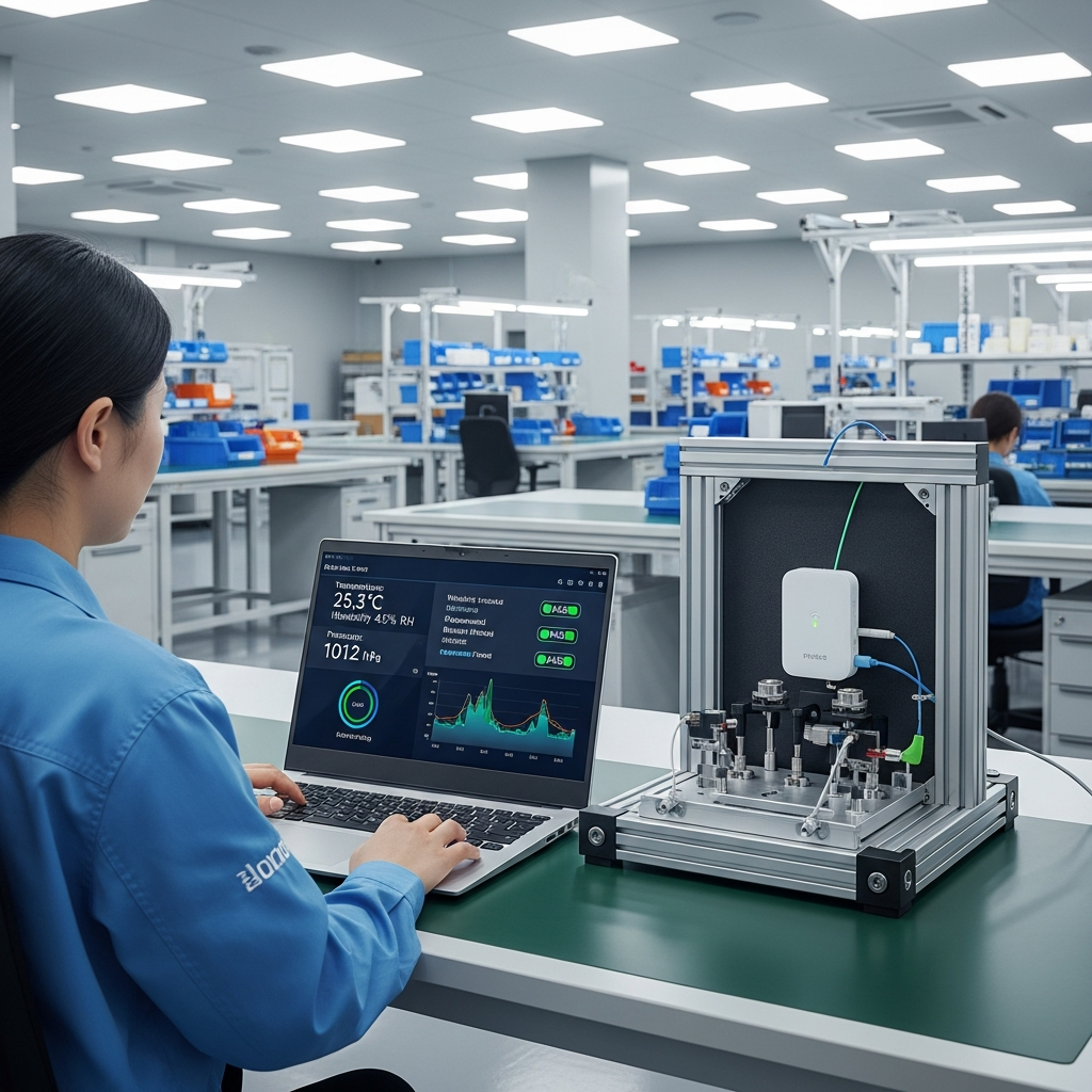 양산 라인에서 IoT 디바이스 기능 검사를 위해 테스트 지그에 제품을 장착하고 시리얼을 스캔하는 장면, 검사·추적성 관리, CAPA 파트너 사례