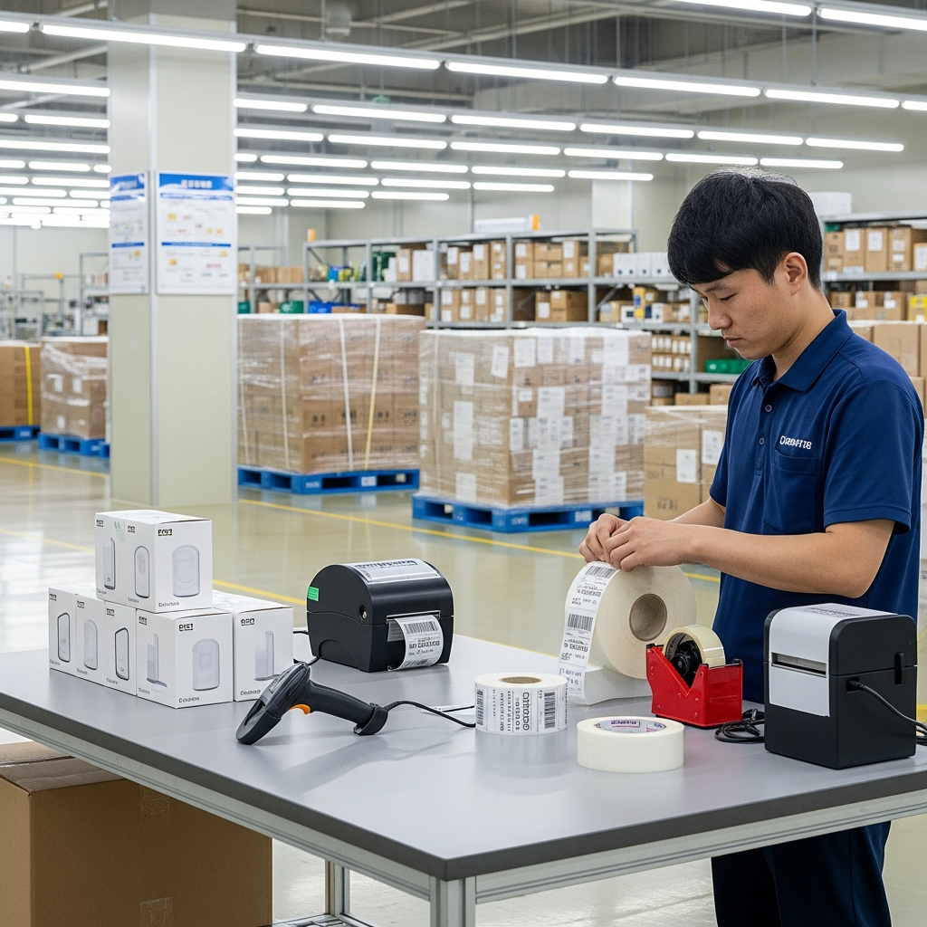 IoT 제품 OEM 공장에서 완성품을 포장하며 시리얼·로트 라벨을 부착하는 장면, 출하 검사·이력 추적 체계를 보여주는 현장, CAPA 파트너 사례