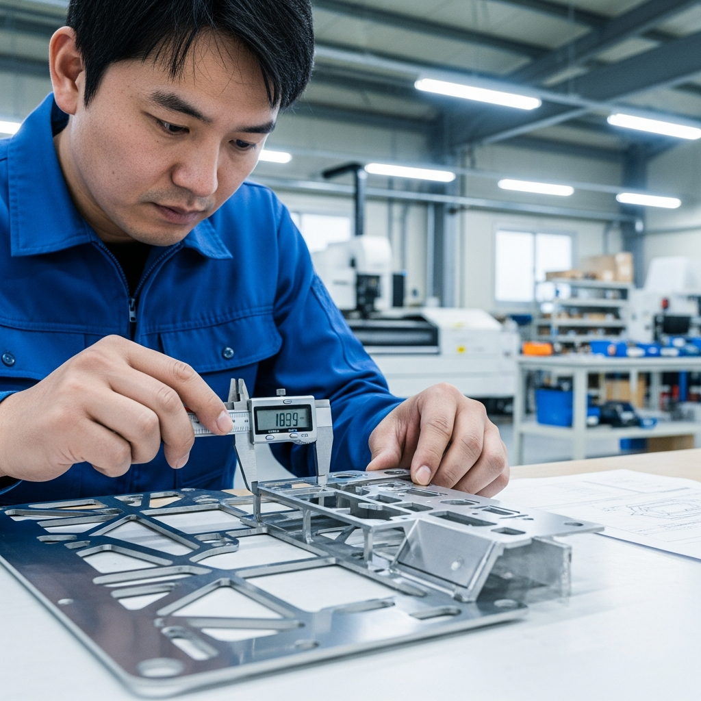 레이저 커팅 부품을 캘리퍼스로 측정하며 공차와 버 품질을 확인하는 검사 공정, 납품 품질 관리, CAPA 사례