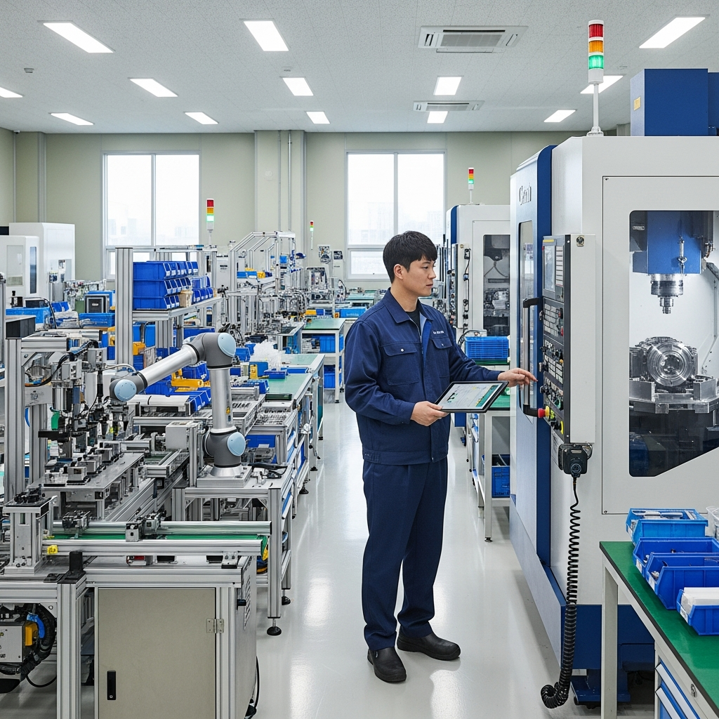 중소 제조 공장의 생산 라인에서 CNC 가공기와 자동 조립 장비를 점검하는 엔지니어가 공정과 장비 배치를 확인하는 장면, 생산 장비 선택과 CAPA 제조 파트너 활용 맥락을 함께 보여줍니다.