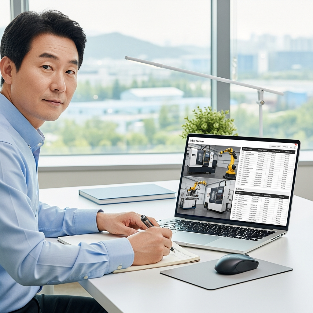 제조 담당자가 노트북으로 여러 공장의 생산 장비 사진과 조건을 비교하면서 OEM 파트너를 검토하는 모습으로 CAPA 플랫폼을 활용해 적합한 공장을 찾는 실제 업무 상황을 표현합니다.