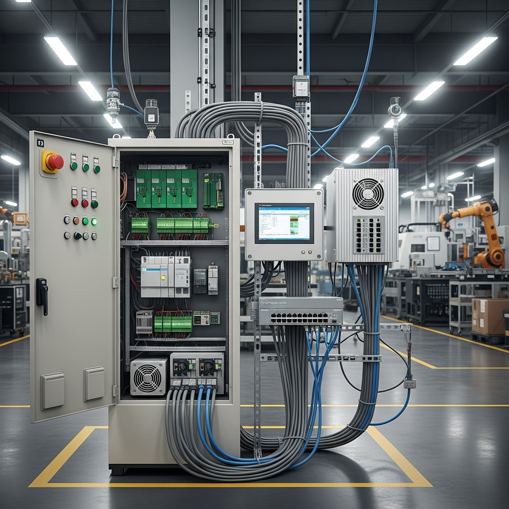 PLC와 센서 데이터를 네트워크로 수집해 MES 시스템에 연동하는 설비 인터페이스 점검 장면, CAPA