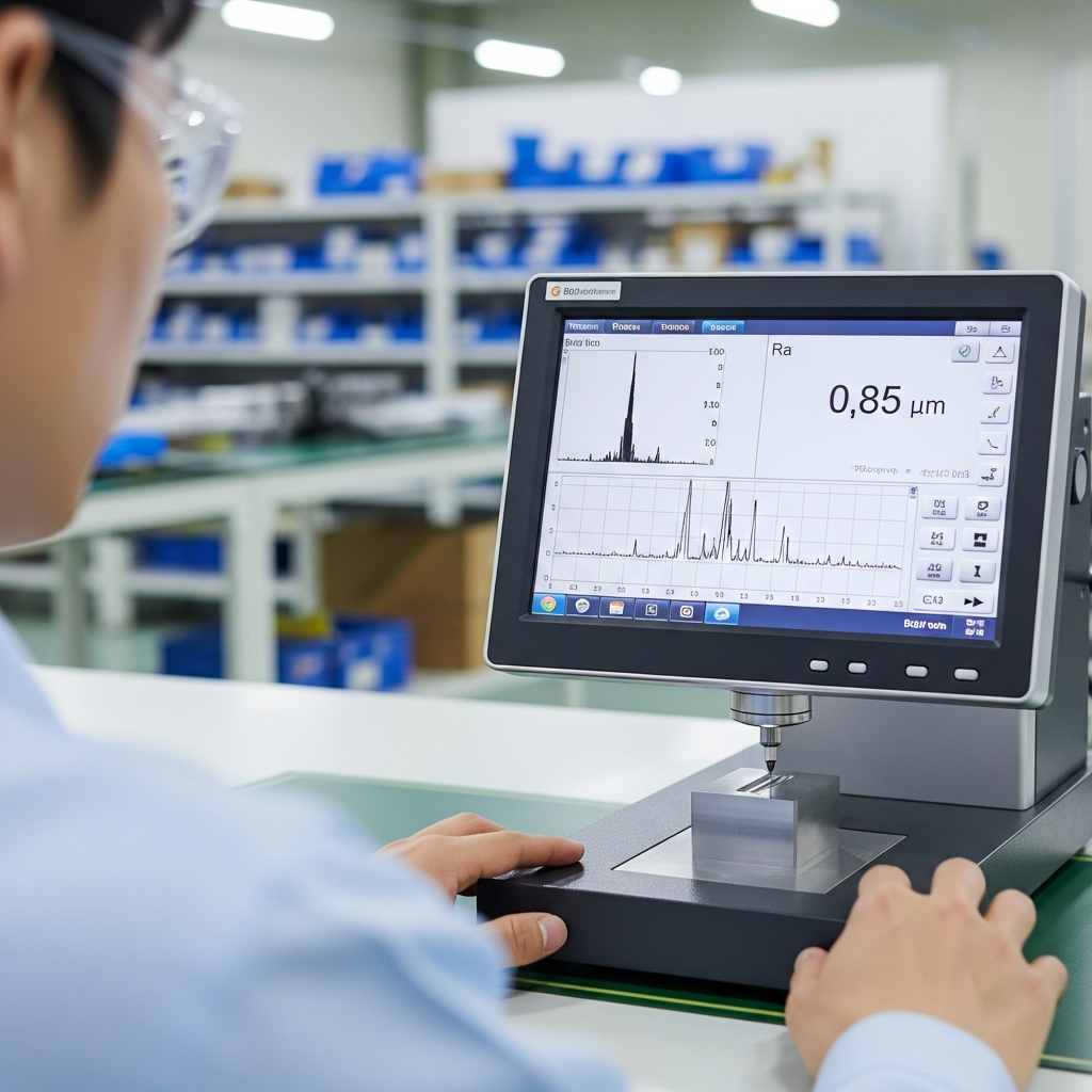 표면거칠기 측정기로 Ra를 검사하는 연마 품질 검사 과정, 도면 사양 검증과 출하 기준 확인을 수행하는 현장, CAPA 파트너