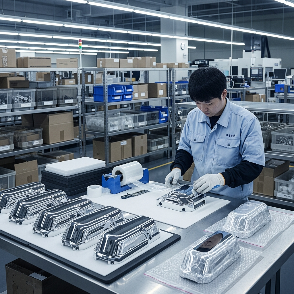 미러 폴리싱된 알루미늄 부품을 보호필름과 완충재로 개별 포장하는 출하 준비, 스크래치 방지 연마 품질 관리, CAPA 파트너