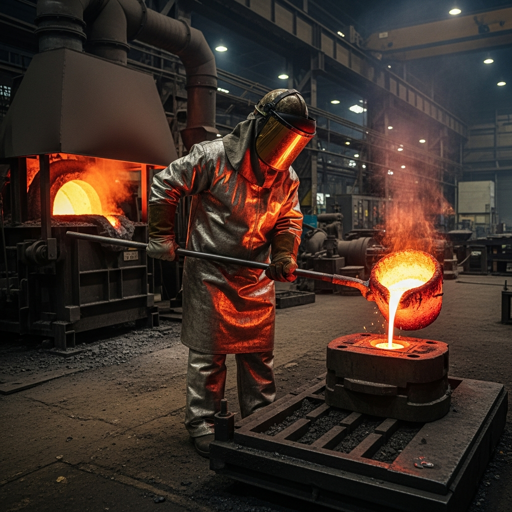 사형주조 현장에서 보호구를 착용한 작업자가 용탕을 사형에 주입하며 온도·주입 속도·수율을 기록하는 장면, 슬래그 제거와 기공 저감 관리, CAPA